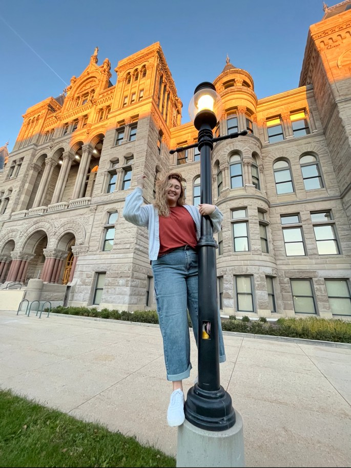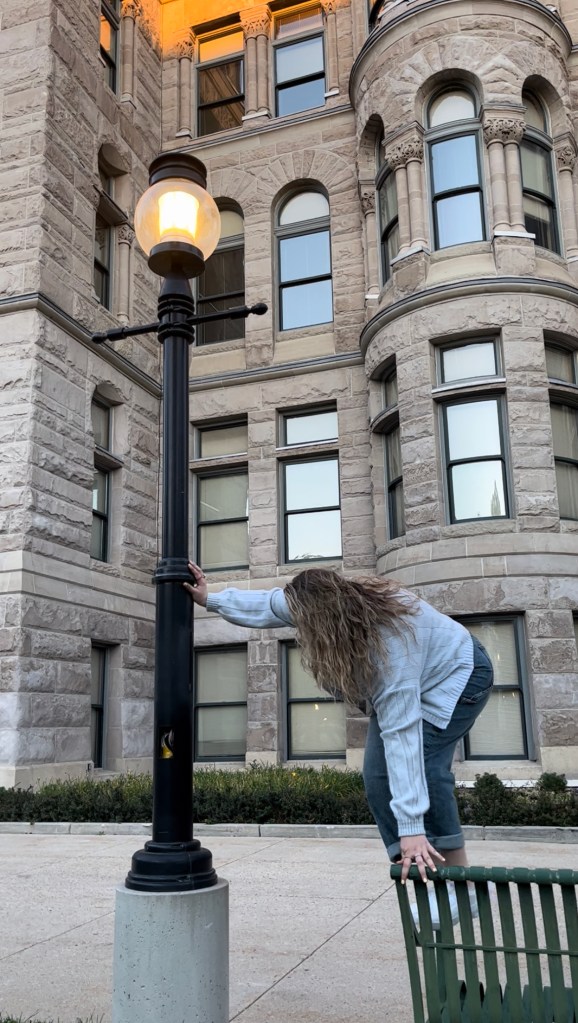As it was a public area we had lots of opportunities to use beautiful light posts as well as water fountains to make more interesting photos. We timed the photoshoot for “golden hour” so that the use of shadow could diffuse the light and it would not be as harsh. Then we picked a color pallet that worked well with the area. This combined created some really fun and interesting photos, some of which the model chose to post on her social media.