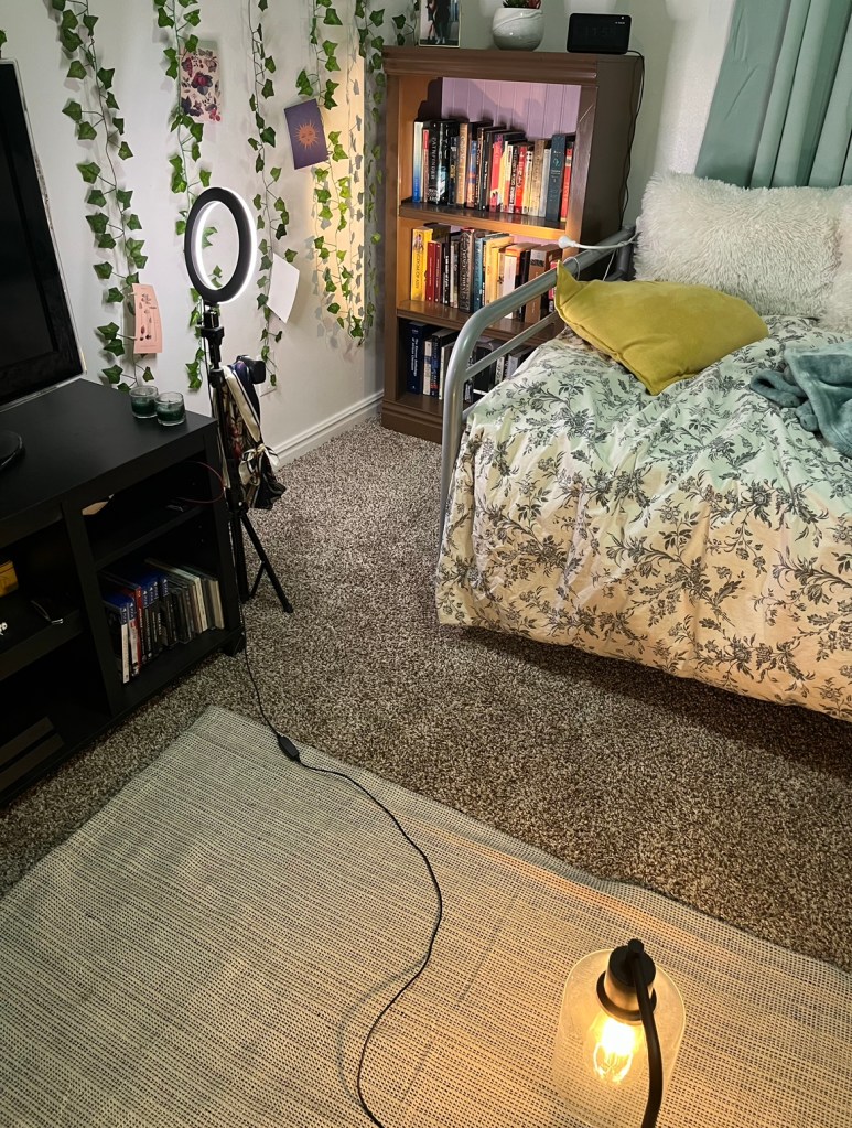 Lighting was my next step. I used mirrors, lamps, and windows to create a diffused yellow light on my face throughout the video. I had to time it for when the light came through the window at the right angle and used no less than three lamps for the final effect. It was worth it, however, and the video quality came out exactly as I had envisioned.